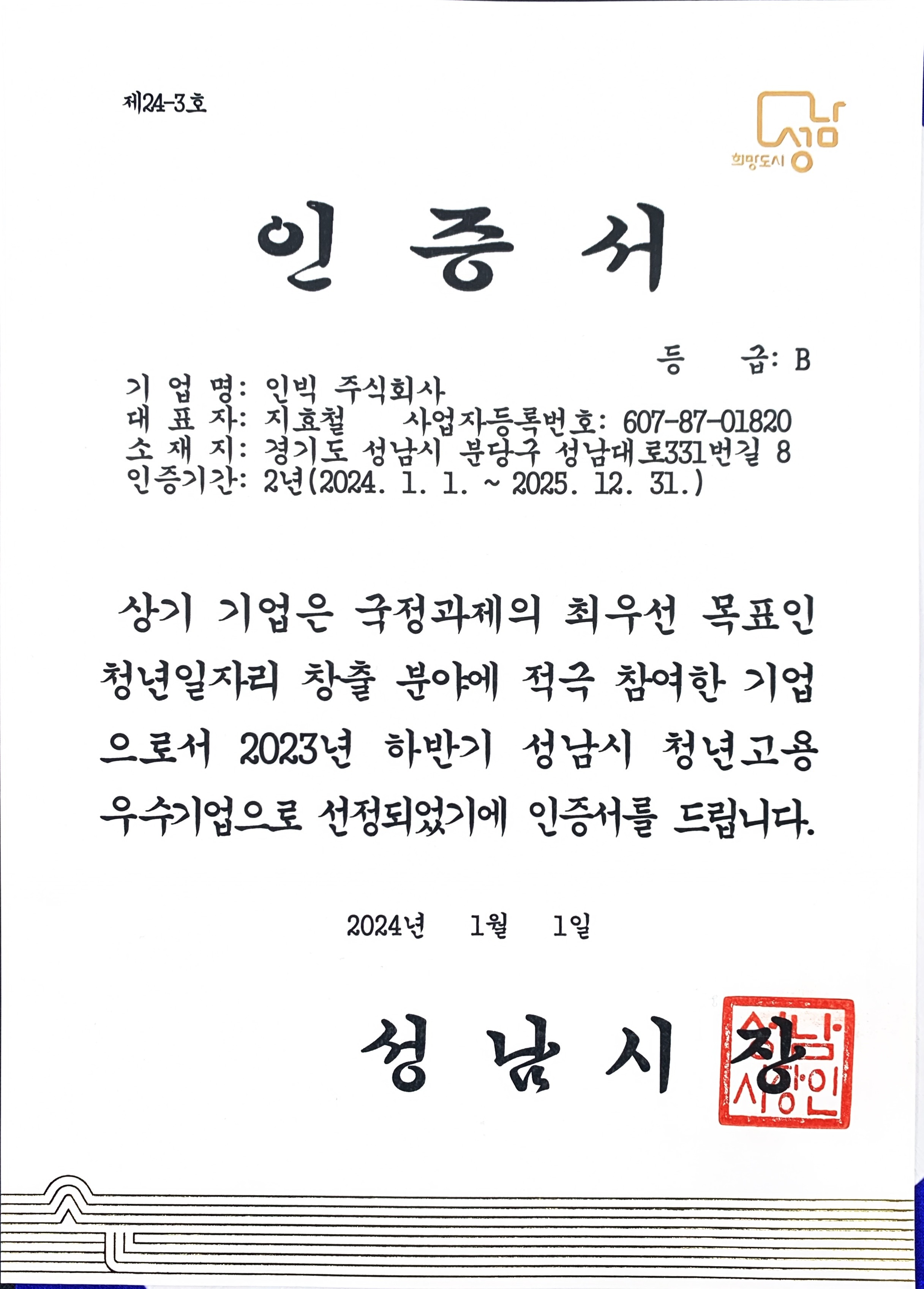 성남시청년고용우수기업인증서
